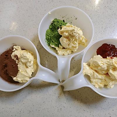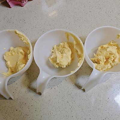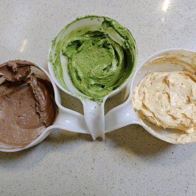 18、将黄油平均分成三份 : 一份加 8g 抹茶粉,一份加 10g 可可粉,一份加 30g 果酱。