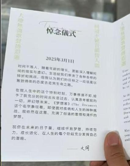 根据记者从大理市殡仪馆了解到的信息,方大同的悼念仪式已经在 3 月 1 日本在场馆举行,随后其遗体被火化。 。对方大同是否会葬在大理,馆方表示具体情况需要询问其家属。在悼念仪式上,每位嘉宾收到的手卡公布了方大同留下的最后一句话:“时间不等人。随着年龄的增长,我们可以更好地理解时间的现实和幻觉。人生给我们带来了各种各样的转折和挑战,但是我认为我们的目标之一就是以优雅得当的态度走完人生的道路。""祝你在未来的日子里,继续拥抱理想,继续努力,成长进化,在人生的每一个阶段都充分发挥自己的潜能。"