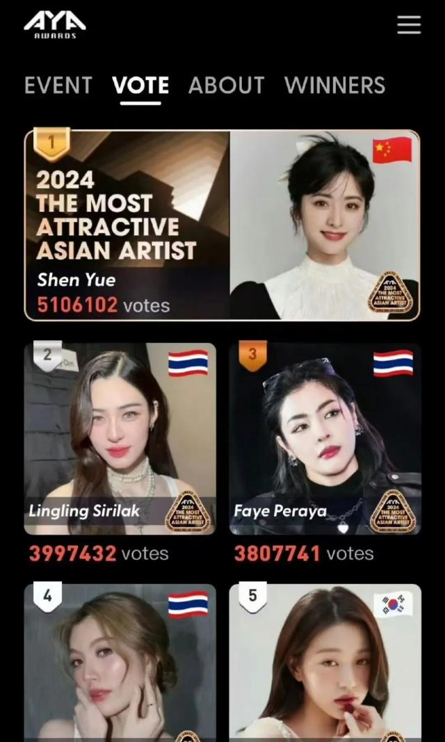 虽然沈月在内娱观众中并不出名,但沈月在国外却非常火爆,在国外却非常火爆,在国外, 2024 年度亚洲魅力艺人评选中,沈月以 5106102 票数排名第一,也是前五名中唯一的中国艺人。