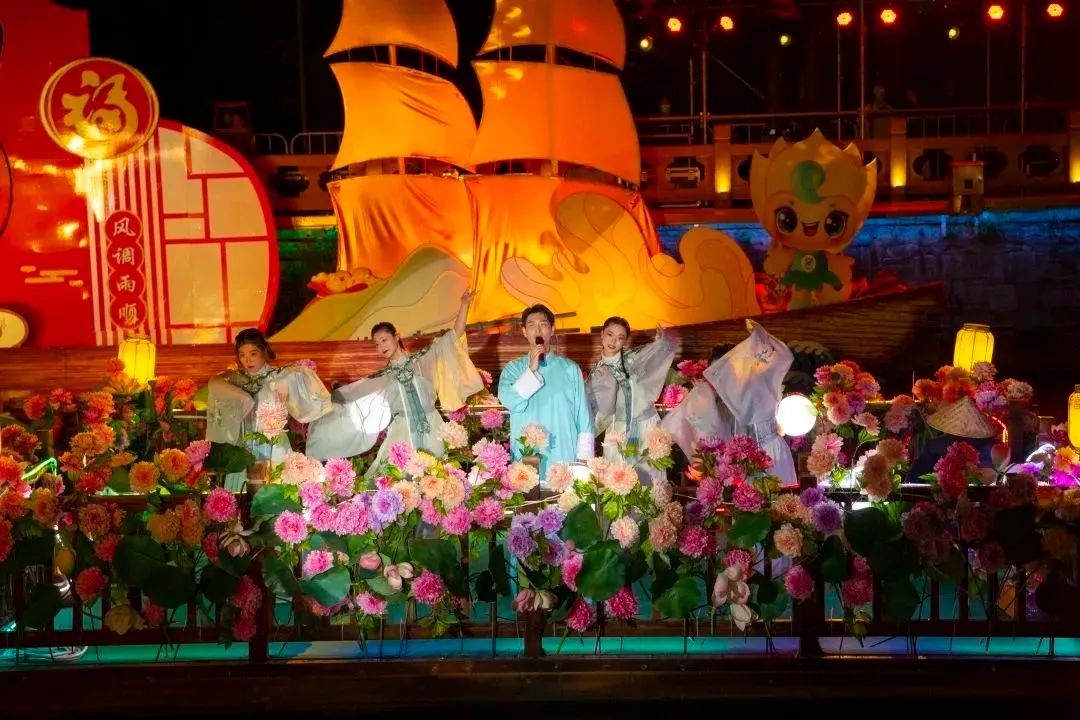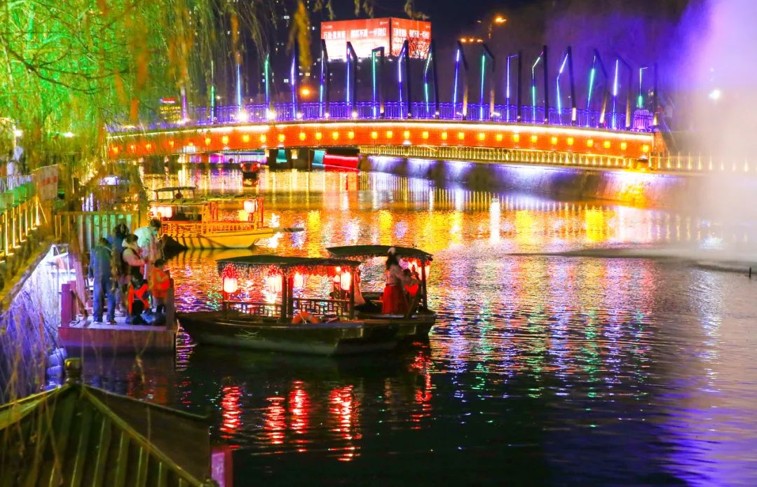 夜幕降临,盐河上的画船漫游,波光灯影,歌声悠扬,与河畔、拱桥上五彩缤纷的灯光共同构成了一个永不阑珊的奇幻夜晚。