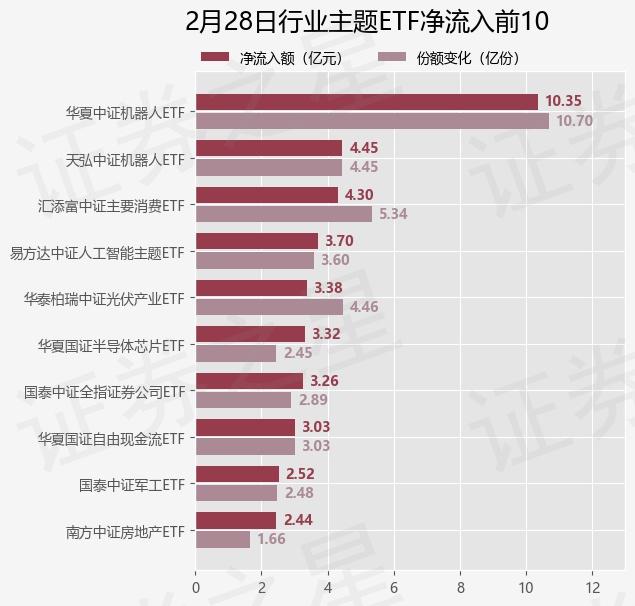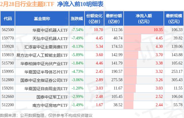 当天有 178 只行业主题 ETF 资金净流入显示,其中华夏中证机器人净流入排名第一。 ETF(562500),份额增加 10.7 十亿份,净流入额为 10.35 亿元。