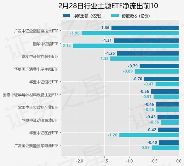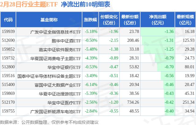 当天有 109 只行业主题 ETF 资金净流出的基金,其中净流出排名第一的是广发中证全指信息技术。 ETF(159939),份额下降 1.96 一亿份,净流出额为 1.36 亿元。