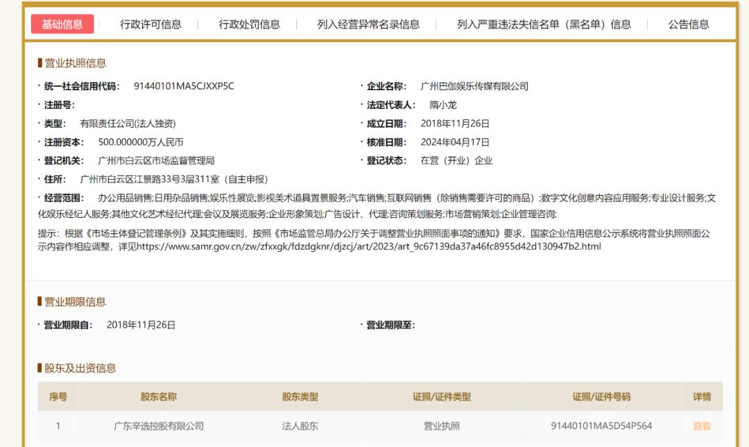 根据国家企业信用信息公示系统,巴伽娱乐是辛选集团的控股子公司,经营范围包括趣味展览、影视艺术道具搭景服务、文化娱乐经纪人服务、网络销售等。法定代表人是隋某龙,公司监事是初瑞雪。