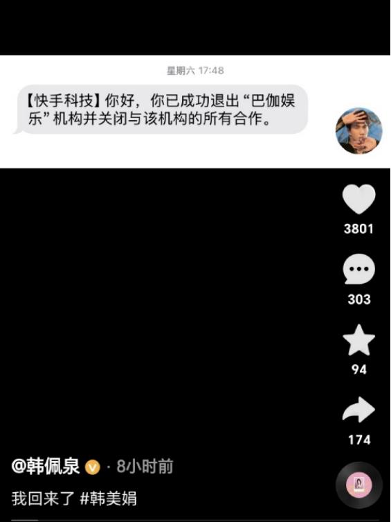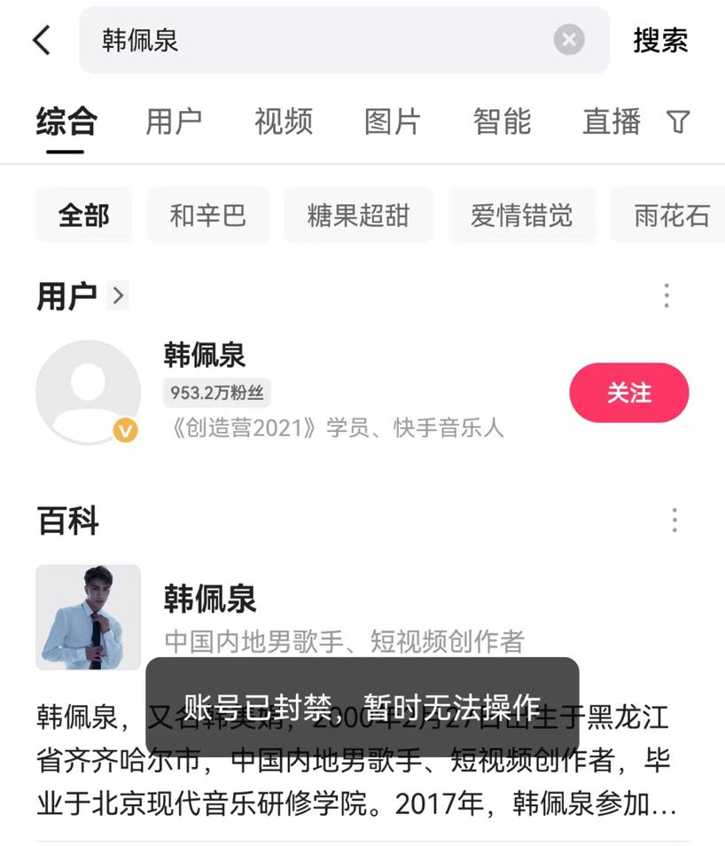 2月26日,韩佩泉在Aautorapper平台直播中表示,“合同签订到期后,不需要征得个人同意,直接续签相当于签了一辈子。按照北京法院的判决,我应该为它造成的真正损失支付600多万元,现在已经全部还清并解除合同。”直播结束后不久,韩佩泉快手账号就被封了,搜索关注韩佩泉账号就显示“账号已经封禁,暂时无法操作”。