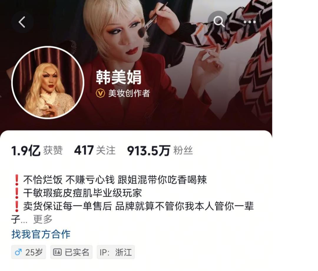 公开信息显示,除了运营快手平台外,韩佩泉于2019年8月进入抖音,注册账户名为“韩美娟”。同年,因为“百因必有果,你的报应就是我”的搞笑名言和夸张的欧美妆容风靡全网,粉丝数量迅速超过1000万,成为当年的“优秀网络名人”。截至目前,抖音“韩美娟”账号已被认证为美容创作者,粉丝数量为913.5万。
