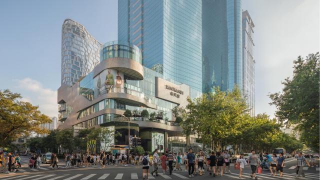 瑞安广场商业裙位于淮海中路东段,是这两个重要商业区的交叉口,南接新世界。在节能低碳领域,瑞安广场的商业裙经过精心改造,获得了上海市现有建筑节能改造金奖和 LEED CS 金奖认证和 LEED O&M 许多荣誉,如铂金认证。