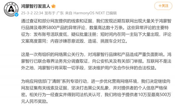 3 月 2 当天晚上,官微鸿蒙智行发言人发布了一条消息,向众多网友选择了相关的黑色公关线索,最多可以奖励。 500 万元。