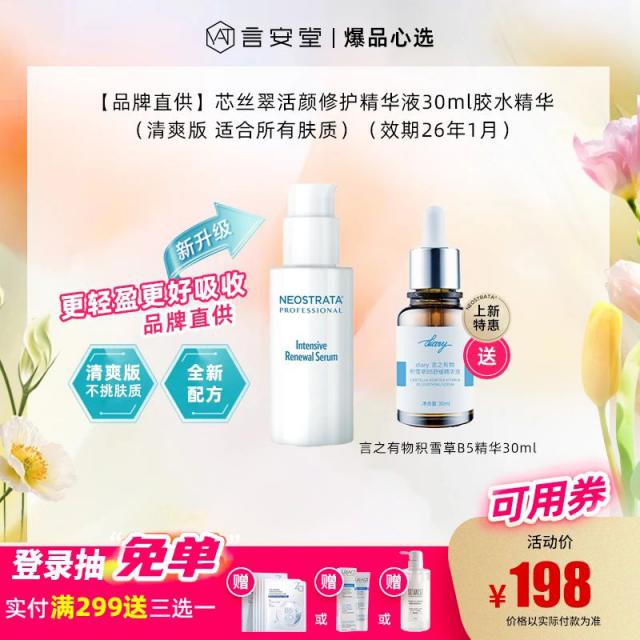 直截了当,言言为大家赢得了新的优惠,一瓶 30ml 清新版胶水精华,只要 198 元,还加了一瓶言之有物。 30ml 的积雪草 B5 精粹 1
