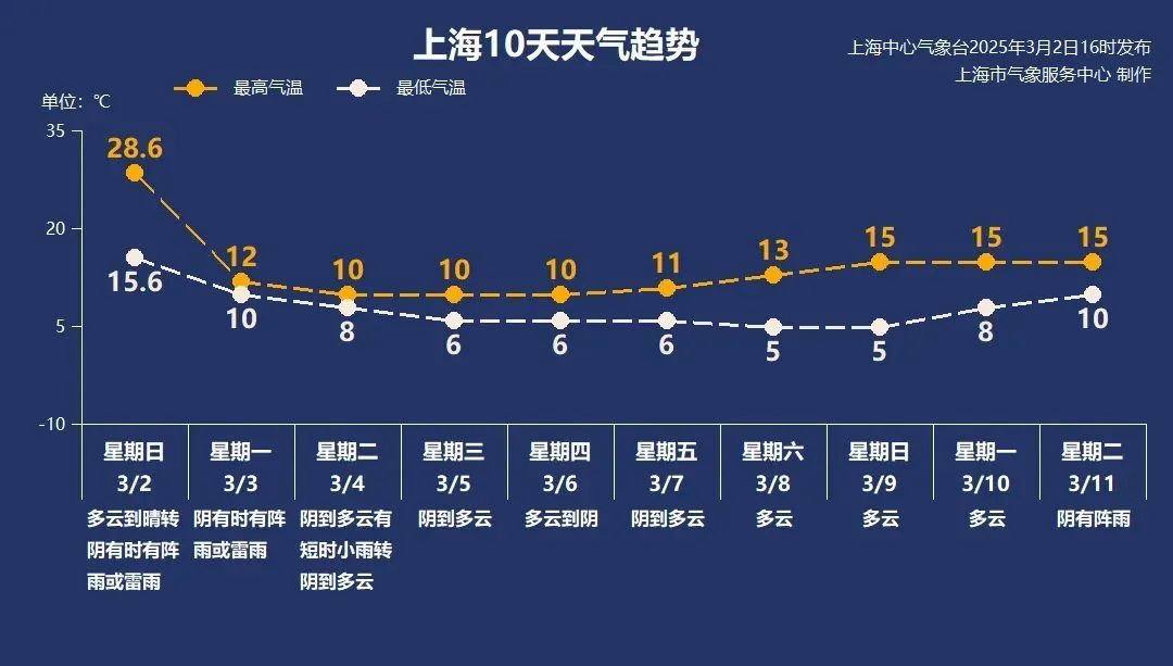 一般来说,本周先雨后晴,气温低。冷空气控制场后,周二雨水逐渐停止,白天有一些短期的小雨,然后主要是阴天或多云的天气。气温暂时很难明显上升,最低气温逐渐下降到5℃左右。最高气温为“1”,周末随着南风再次升至15℃左右。冬天和春天变化时,天气变暖变冷。请根据天气变化合理安排你的工作和生活。