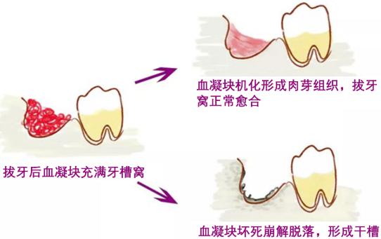 假如血块脱落,牙槽就会暴露在充满细菌的口腔中,一旦骨壁感染,就会变成干槽症。