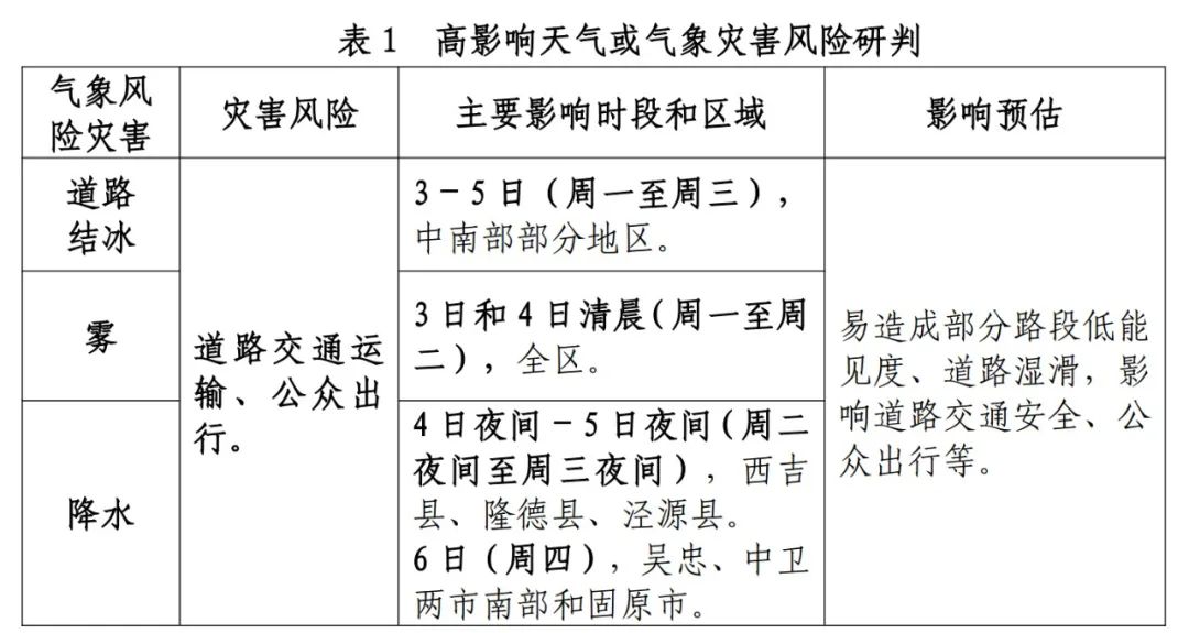 根据宁夏气象局的消息,未来一周全区以多云天气为主,3日和4日上午有轻雾或雾(可见度在 1~9 千米),5-6日中南部有雨夹雪或小雪,气温逐渐升高,9日全区最高气温升至 5~15°C,最低气温升至-5~-1~°C。请注意道路面积雪结冰、降水、雾对道路交通安全等不利影响,做好预防工作。