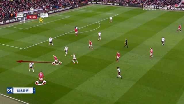 前半场曼联 12 大部分次传都是从左路开始的,使用齐尔克泽 B 费在中路吸引防守。达洛特和马兹拉维在两侧拉宽了总宽度。两边的中后卫可以直接联系边后卫。边后卫顺下把这条路线传到边前腰。咪咕在中场休息时也解释了这一点。曼联上半场的第一次射门就是这样来的。