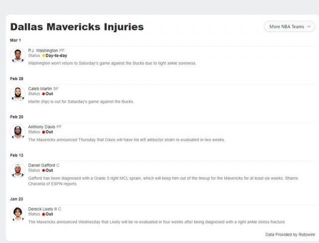 你可以看看独行侠的阵容状态:华盛顿右脚踝疼痛,凯莱布 - 马丁臀部受伤,浓眉左腿内收肌拉伤,加福德内侧副韧带三级扭伤,莱夫利应力性骨折。6 一个核心不能上场,欧文怎么进球?