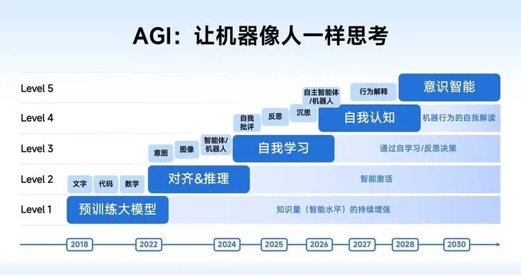 按照唐杰的分享,他将AGI分为五个阶段,L1展示了世界知识和推理能力;L2 时间多模态对齐后有更深层次的推理能力; L3 层次,原生多模态模型可以实现人类般的感觉和联觉。(Synesthesia),以及物理世界与虚拟环境的融合,以及L3 自学阶段,AI 自我学习可以通过自我分析、反思甚至思考来实现;L4 当时,机器开始实现自主学习;L5 观念智能是 AGI 最后一个层次,即 AI 将来的某一天,会有一些想法,能像人一样突破现在的天花板,去探索、研究、寻找新的科学边界。