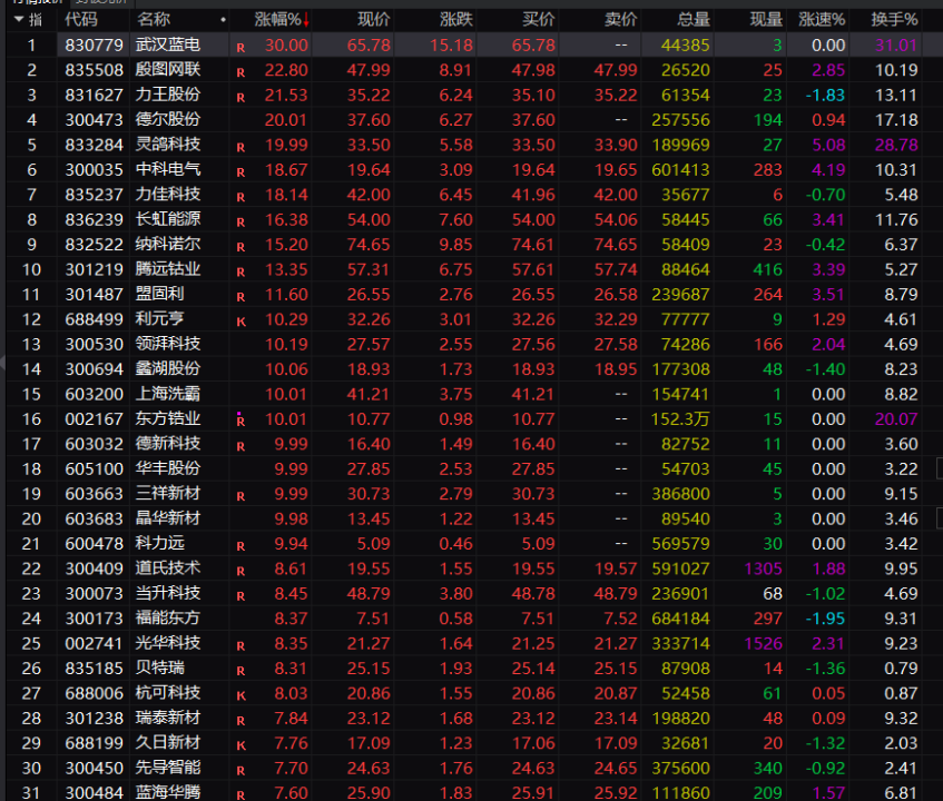 今天早上,固态电池的概念完全爆炸了。武汉蓝电涨停30%,殷图网联、灵鸽科技、纳科诺尔、李佳科技、长虹能源涨停10%以上,涨停10%以上的股票一度达到21只。几乎整个板块都在上涨。