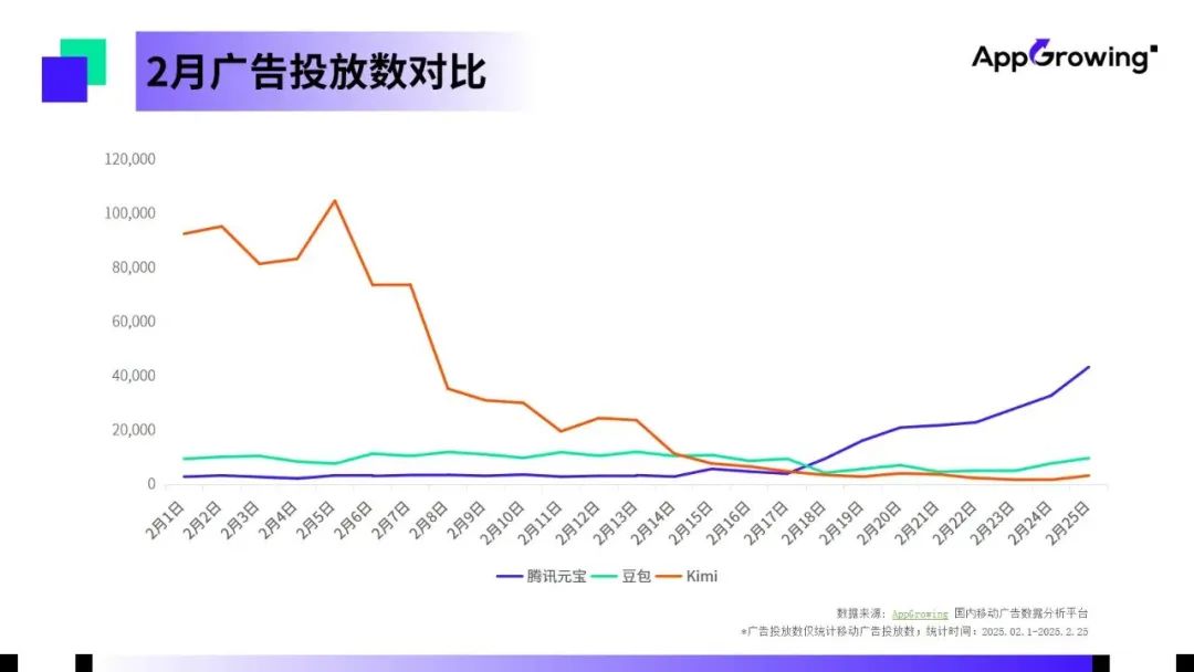 AppGrowing数据显示,腾讯元宝的广告在2025年2月18日之前处于较低水平,明显弱于Kimi。、豆包。