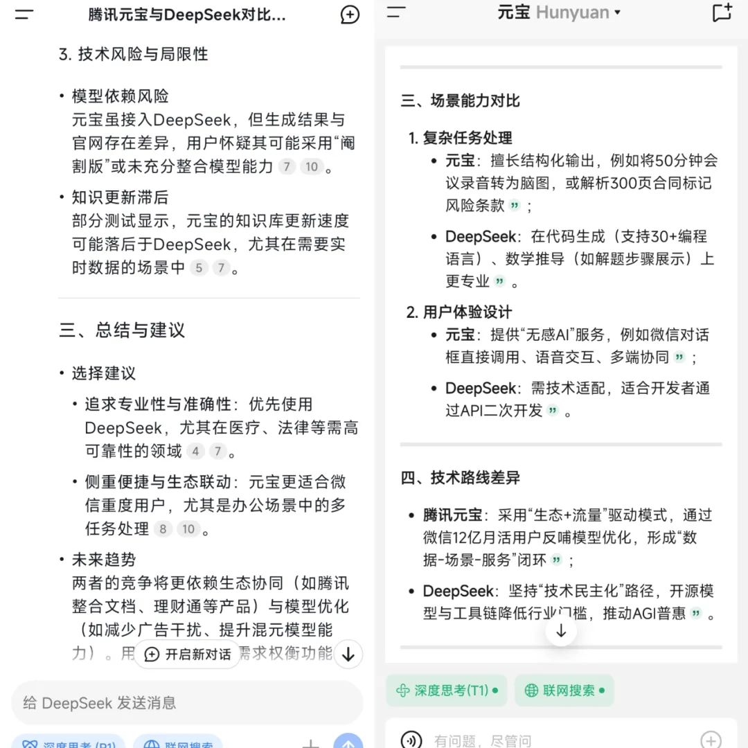 从这个角度来看,如果客户是微信的重度用户,需要与微信生态无缝衔接,高效处理职场任务,腾讯元宝是更好的选择;如果你追求专业性和准确性,尤其是在法律、医疗等领域,或者需要灵活的二次开发,DeepSeek更有优势。