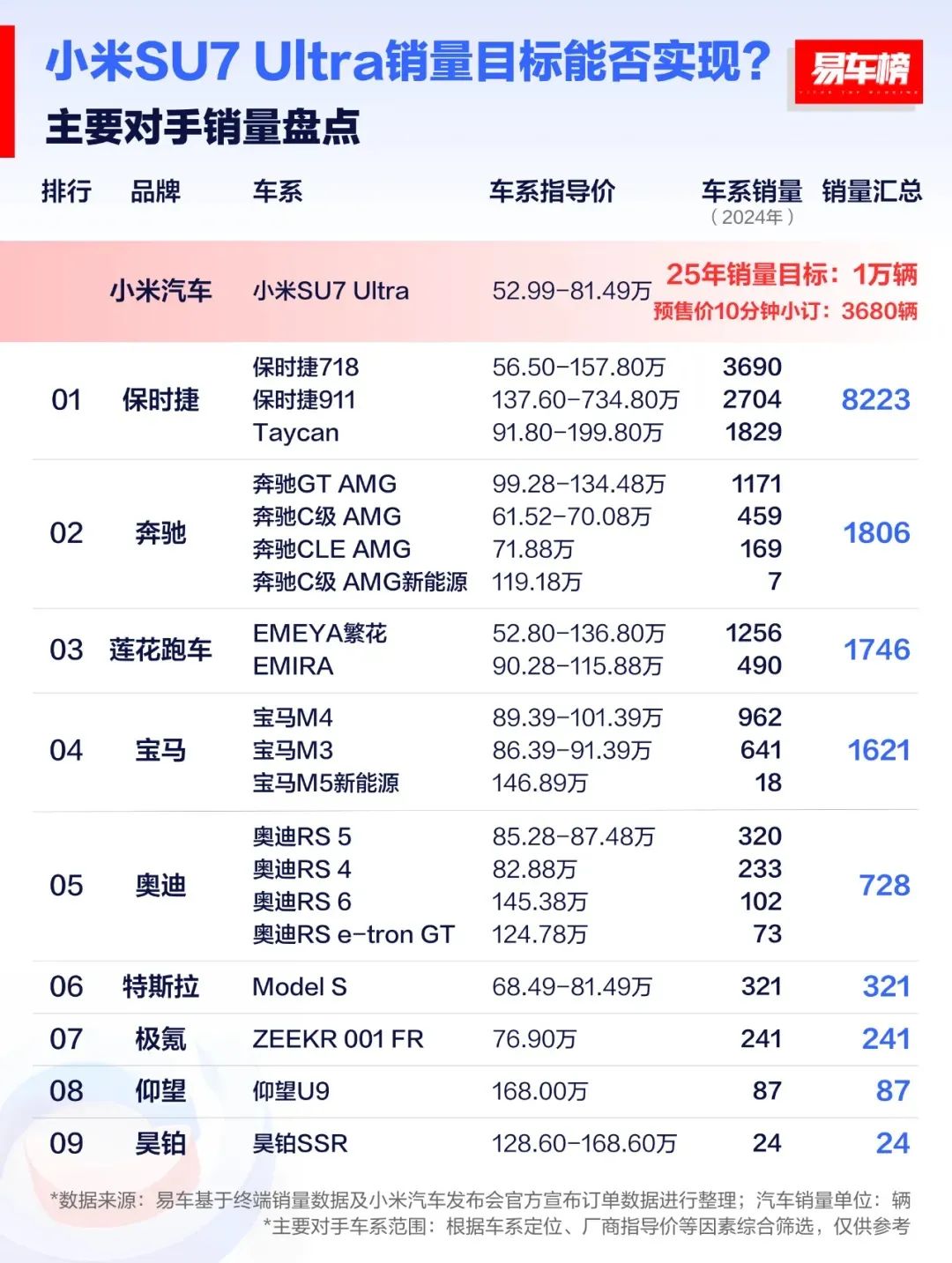 SU7按易车排行榜排列。 Ultra的主要竞争对手包括保时捷Taycanan、奔驰GT AMG、EMIRA莲花、宝马M4、宝马M3、奥迪RS 5、Model S、ZEEKR 001 FR、仰望U9、昊铂SSR等车型。2024年保时捷品牌在上述主要对手车型所属品牌的终端销售数据中销量最高,3款车共8223辆,远超第二名奔驰的1806辆。