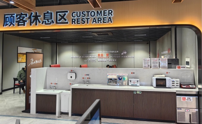 不仅如此,改造后的店铺还设置了新的客户休息区,包括饮水机、微波炉、共享充电宝、水槽、自助加冰站、药箱、纸巾、储物柜、宠物储存等便民设施。