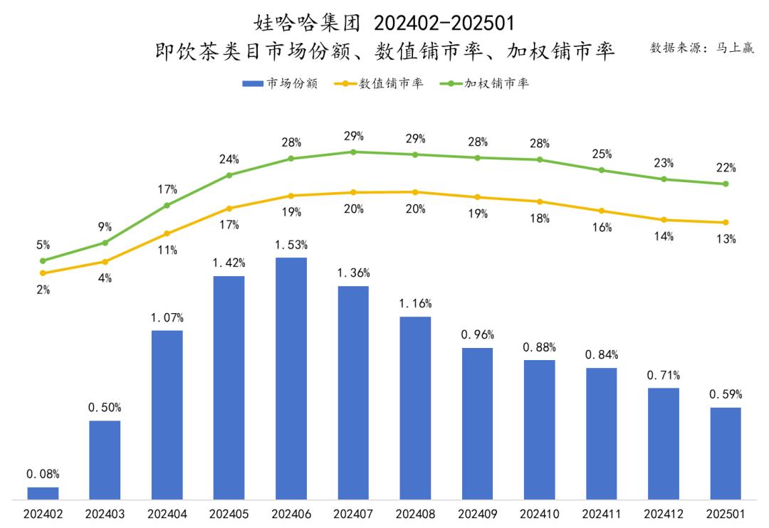 从数据中可以看出,娃哈哈的即饮茶产品在2024年2月至2024年4月通过舆论事件的影响迅速增长,无论是市场份额、数值铺市率/加权铺市率等市场指标。但随着2024年5、六月,夏季,也是传统饮料旺季的到来,娃哈哈在即饮茶品类中的市场份额并未站稳脚跟。在整体稳定的铺市率背景下,随着旺季即饮茶市场的快速增长,其市场份额逐渐受到挤压,自2024年6月以来一直在下降。直到2025年1月,其市场份额走势仍未出现回升的迹象。