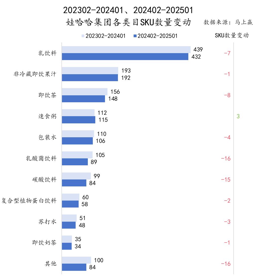 基于上述娃哈哈产品线/商品在过去一年中的调整,以及在品牌CT中立即获胜的相关数据,我们首先获得了202302-202401,以及202402-202501,以及娃哈哈集团在各种食品/饮料品类中的SKU数量变化。