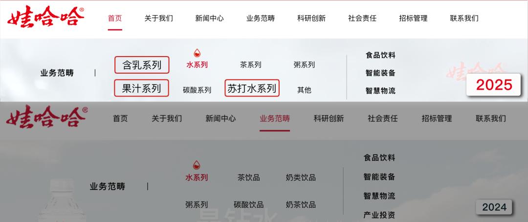 2024年3月,在集团官网的业务范围内,消费品只有六大类:水系列、茶饮料、牛奶饮料、粥系列、炭酸饮料和奶茶饮料。然而,2025年2月,集团官网产品已扩展到含乳系列、水系列、茶系列、粥系列、果汁系列、炭酸系列、苏打水系列等8大类。