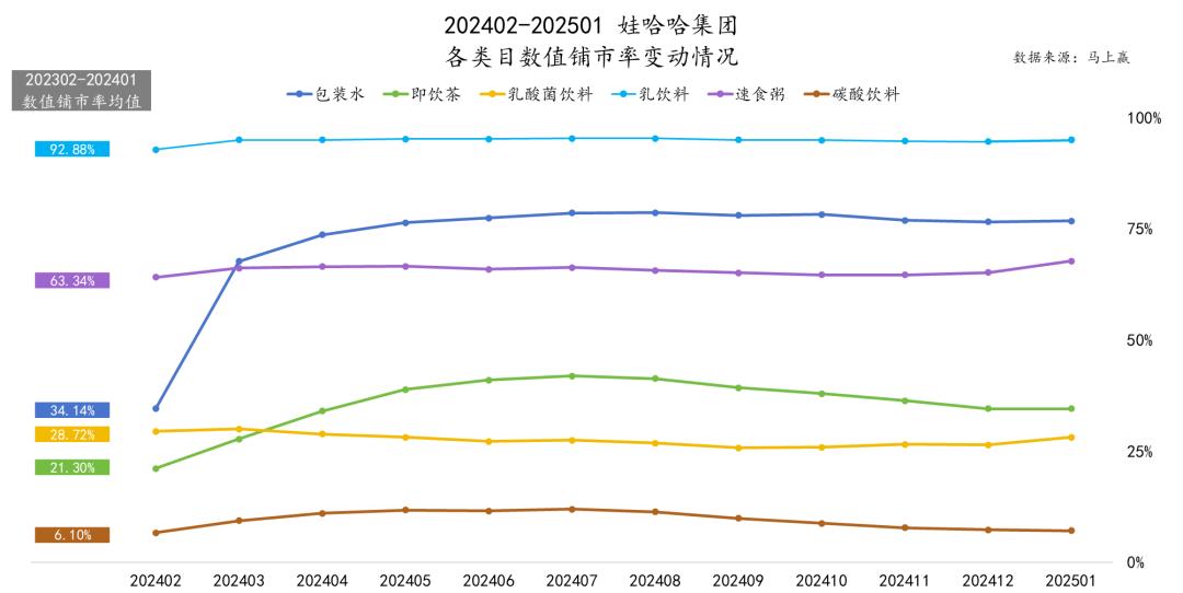从数值铺市率来看,2024年,娃哈哈在少数品类中的数值铺市率有了很大的提升,但仅限于少数品类。