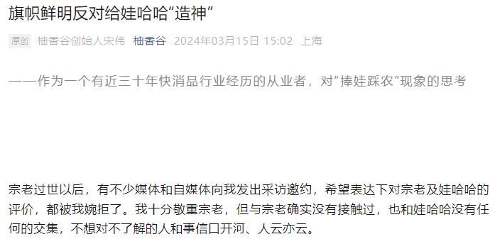 2024年3月中旬,主流舆论纪念宗老时,柚香谷微信官方账号的一篇文章《旗帜鲜明反对给娃哈哈“造神”,似乎给悼念的基调带来了一点不和谐的声音。