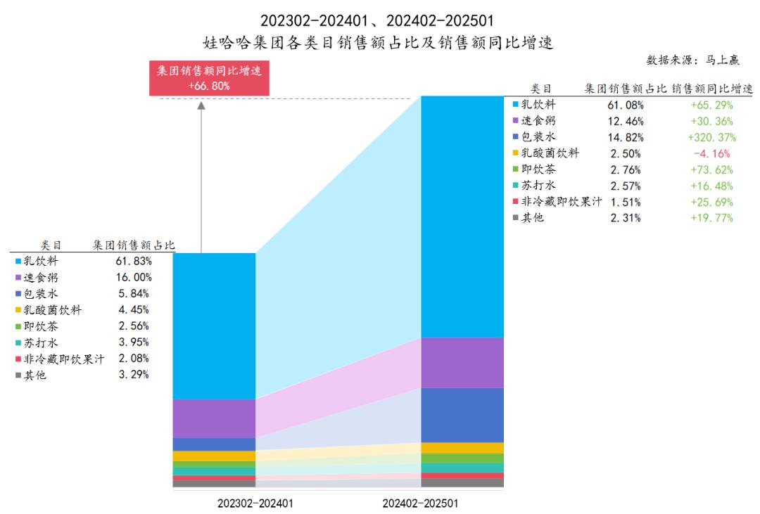 从娃哈哈集团的整体销售情况来看,202402-202501同比为202302-202401,娃哈哈集团的销售额同比增长66.80%,这超过50%,远远领先于食品工业公司的平均销售额同比增长。