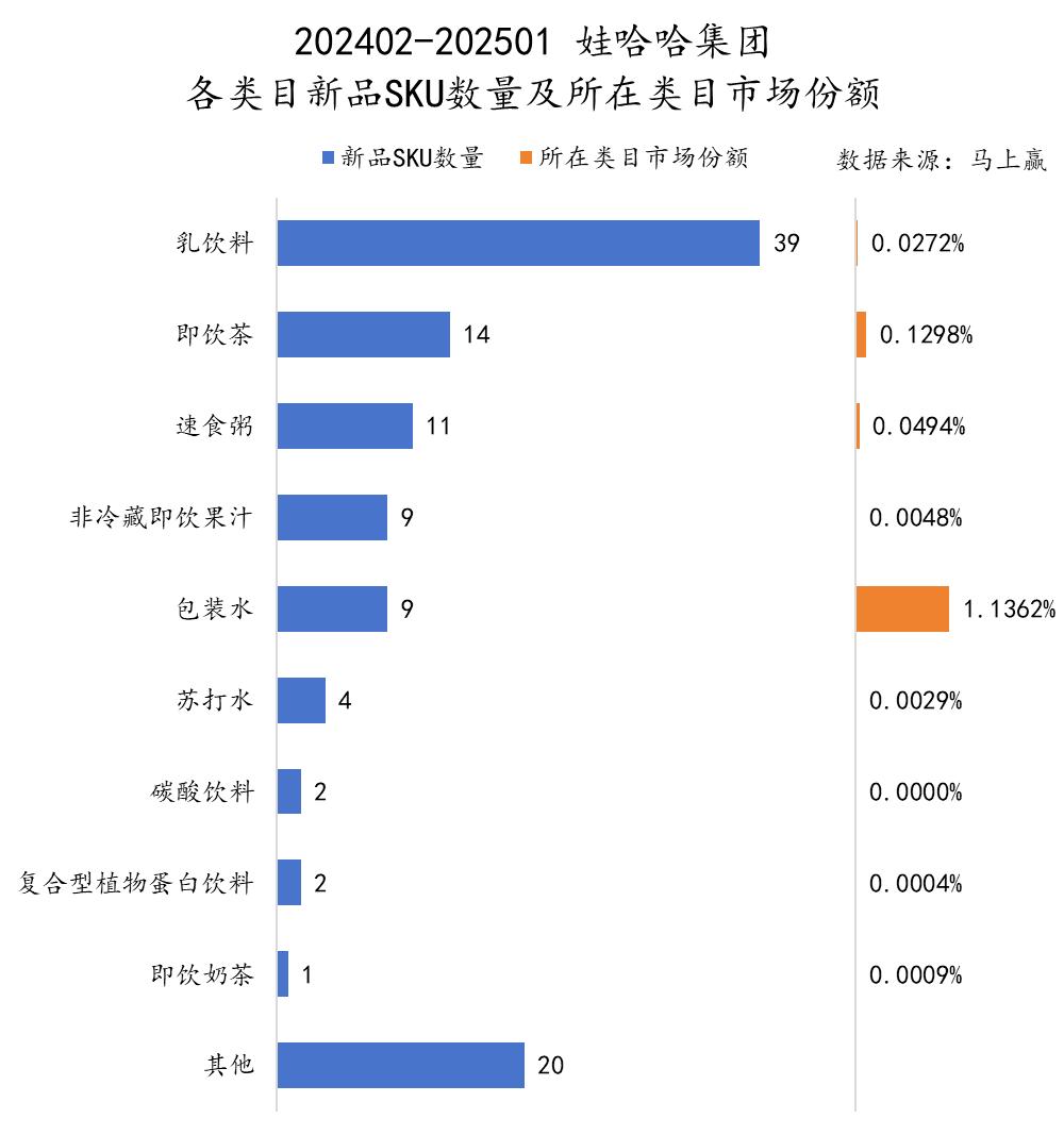 从SKU数量的排名来看,乳饮料、非冷藏即饮果汁、即饮茶排名前三,但根据娃哈哈集团销售/品类比例的排名,乳饮料、速食粥、包装水是销售比例前三的品类。可以看出,虽然部分品类的SKU数量较多,但从集团比例来看,可能还有进一步增长的空间。