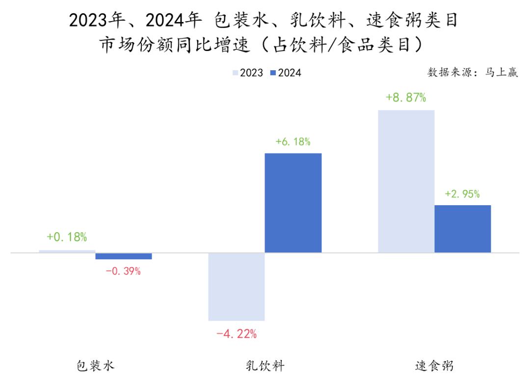根据即时赢得品牌CT的数据,2023、2024年,包装水、牛奶饮料和速食粥类别在饮料/食品类别中的市场份额同比大幅增长。由于娃哈哈的影响,牛奶饮料类别在2024年表现相对较好,但在2023年,同比增速为负;包装水类别的整体份额变化不大。但是它的竞争激烈程度在2024年有了前所未有的提高;虽然2024年速食粥品类仍保持正同比增速,但其同比增速也不如2023年。