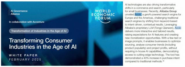 这几天, Accio 还出现在世界经济论坛上的白皮书,被称为白皮书。 AI 改变行业代表性案例。