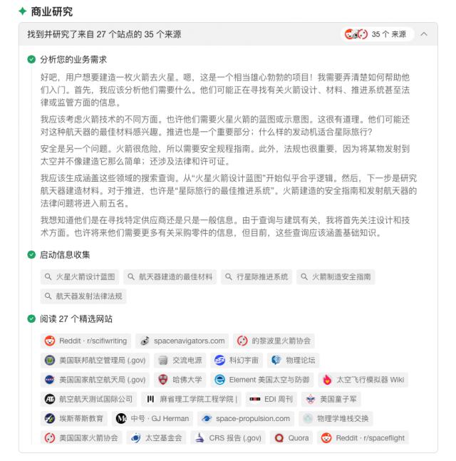 前菜还是我们熟悉的思维链, Accio 首先掐指一算,从火箭设计、材料选择到推进系统,甚至连能不能飞谁说了算的那摊事,都盘了一遍。