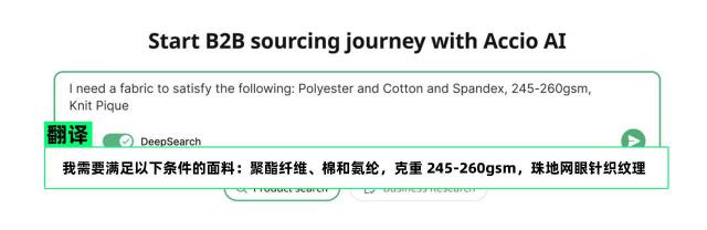让我们举一个更实用的例子。比如差评君开了一家服装厂,现在迫切需要购买一种由聚酯纤维、棉花和氨纶制成的服装厂。重量是 245 至 260 每平方米克,并有珠地网纱针织纹理的面料。