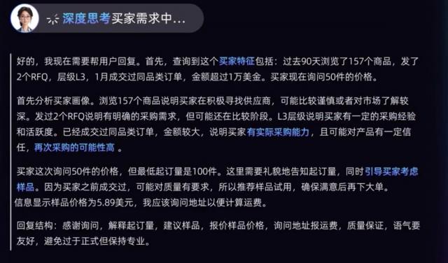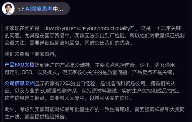 北京时间凌晨 3 点,一些外国买家来购买。 50 双沙滩鞋,招待 Agent 首先根据买主的特点,对一波需求进行分析,然后结合店铺的具体情况,一键生成一个回复。