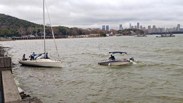 在风暴中,公安快艇向搁浅帆船抛出救援绳。