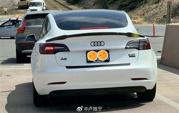 网民发布的图片显示,一辆特斯拉 Cybertruck 末端隔板上,涂装有“ Toyota “象征。还有一辆特斯拉。 Model 车标换成了奥迪,下面还有“” A5 2.0T "标志,看上去也比较和谐。