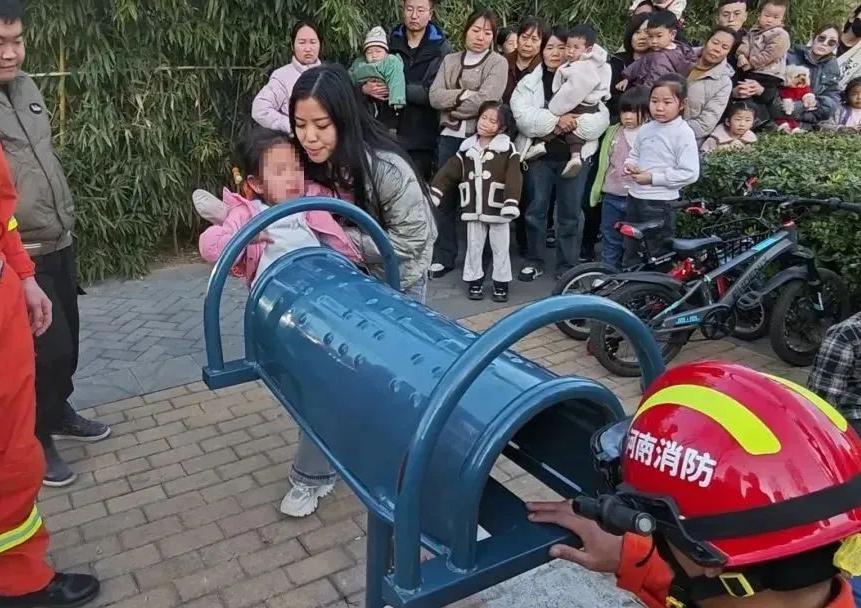 2024年12月1日,在河南洛阳的一个广场上,一个6岁的孩子在玩耍时钻进了一个健身器材。没想到,他的腿被卡在了健身器材的缝隙里,无法自己拔出来。