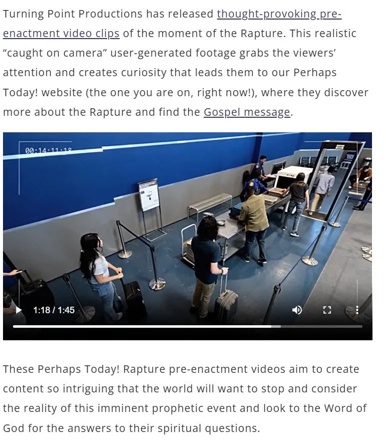 在这个活动网站上,可以找到大量类似网络视频的“人类突然消失”视频。对此,有关解释称,“当‘被提起’时,全世界都会捕捉到这一刻——手机、安全摄像头、执法记录仪、行车记录仪、门铃摄像头都会记录‘大消失’的场景。为了吸引观众浏览活动网站,获得更多“被提及”的信息,本次活动拍摄了“被提及”的预演画面。“这些视频旨在创造吸引观众的内容,让人们停下来思考即将到来的预言事件的真实性,期待上帝回答他们的精神问题。”