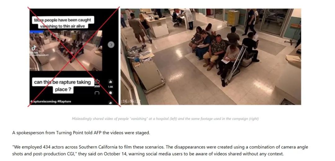 综上所述,美国基督教组织Turning的网络爆炸画面。 Point发起的活动内容,从不同角度拍摄“人类突然消失”的视频,如手机画面、监控摄像头等。,并预演基督徒“被提及”的场景。旨在强调基督教中的“被提”(Rapture)神秘,指向基督再来的希望。有关视频负责人曾经说过,CGI动画技术后期制作的视频。有些片段有显著的“穿帮”镜头。