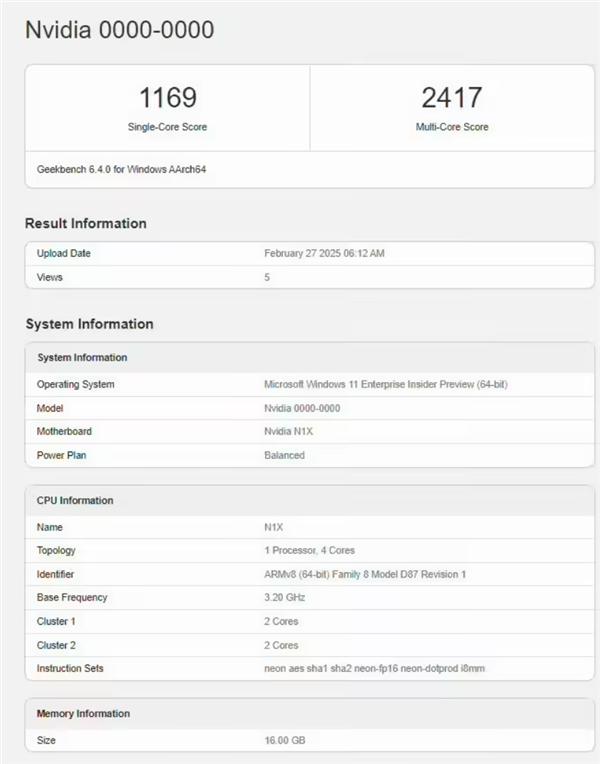 那是英伟达和联发科的实力不行吗?事实上,仔细观察这次测试,发现 Geekbench 上的 N1X 注册为四核的芯片 CPU,并且在测试过程中只开启双核双线程设备,并且测试显示该芯片的默认频率为 3.2GHz,说明目前的测试版还处于开发初期,性能还没有完全释放,所以 Geekbench 上面的跑分数据可能不能完全反映最终产品的具体性能。