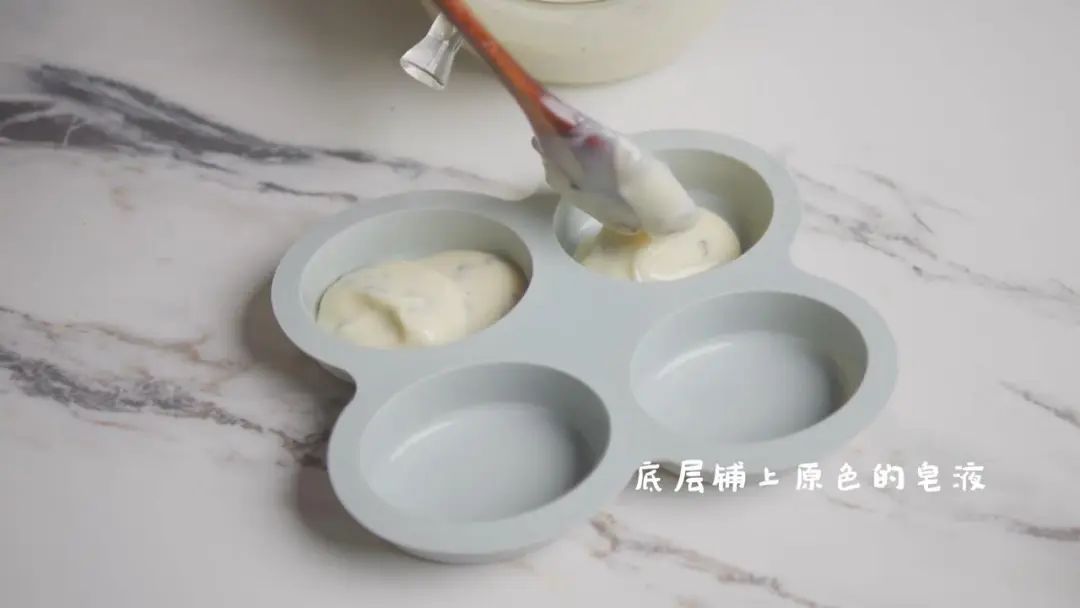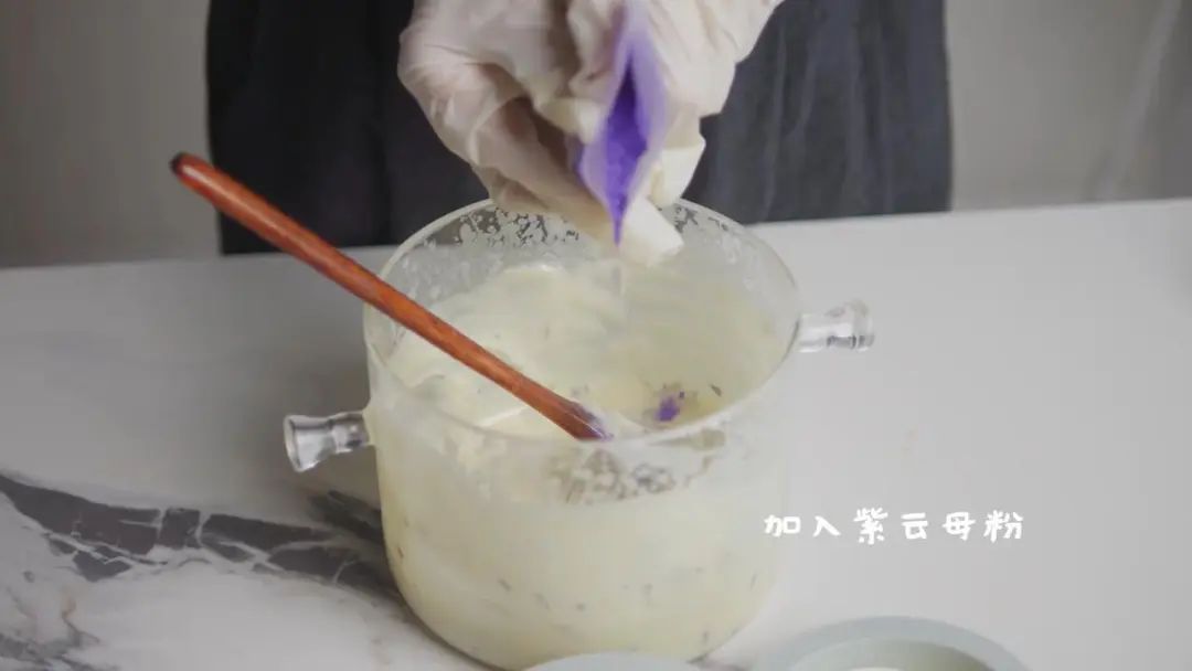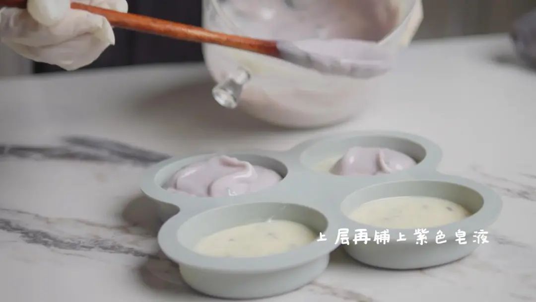 在剩余的皂液中加入紫色云母粉,搅拌均匀,铺上模具。