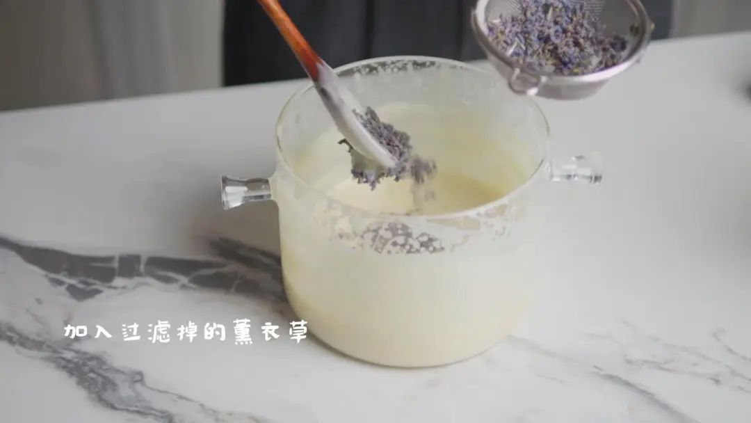 加入过滤后的薰衣草,搅拌均匀,将一些肥皂倒入模具的一半。