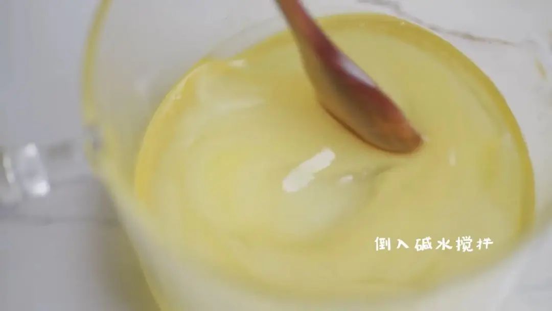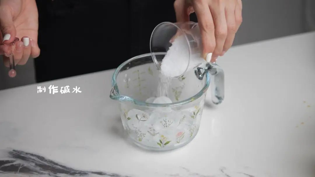在纯净水(冰块)中加入少量多餐加入碱,融化备用。