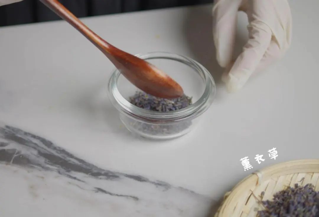将薰衣草放入透明容器中,大约三分之一的地方。