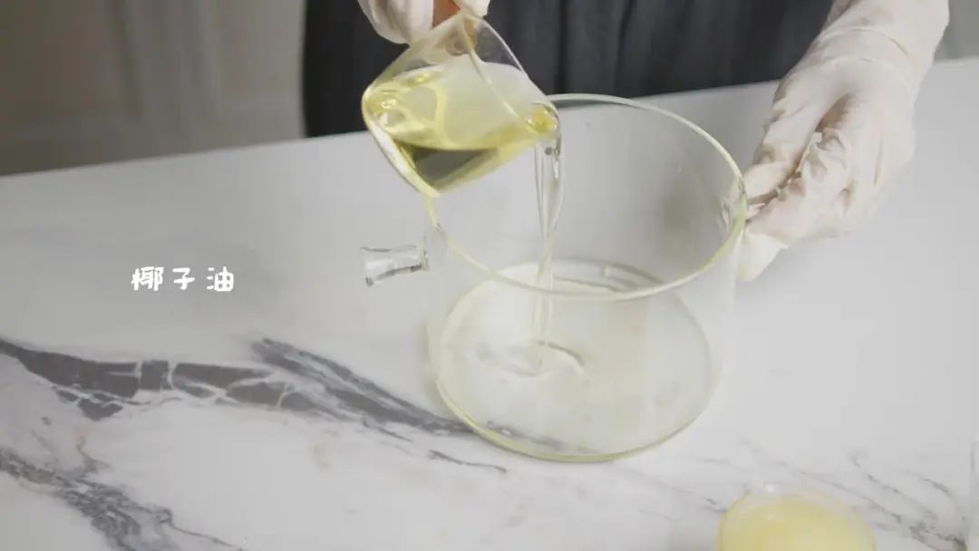 将椰子油、棕榈油、荷荷芭油、薰衣草油倒入容器中,搅拌至粘稠。