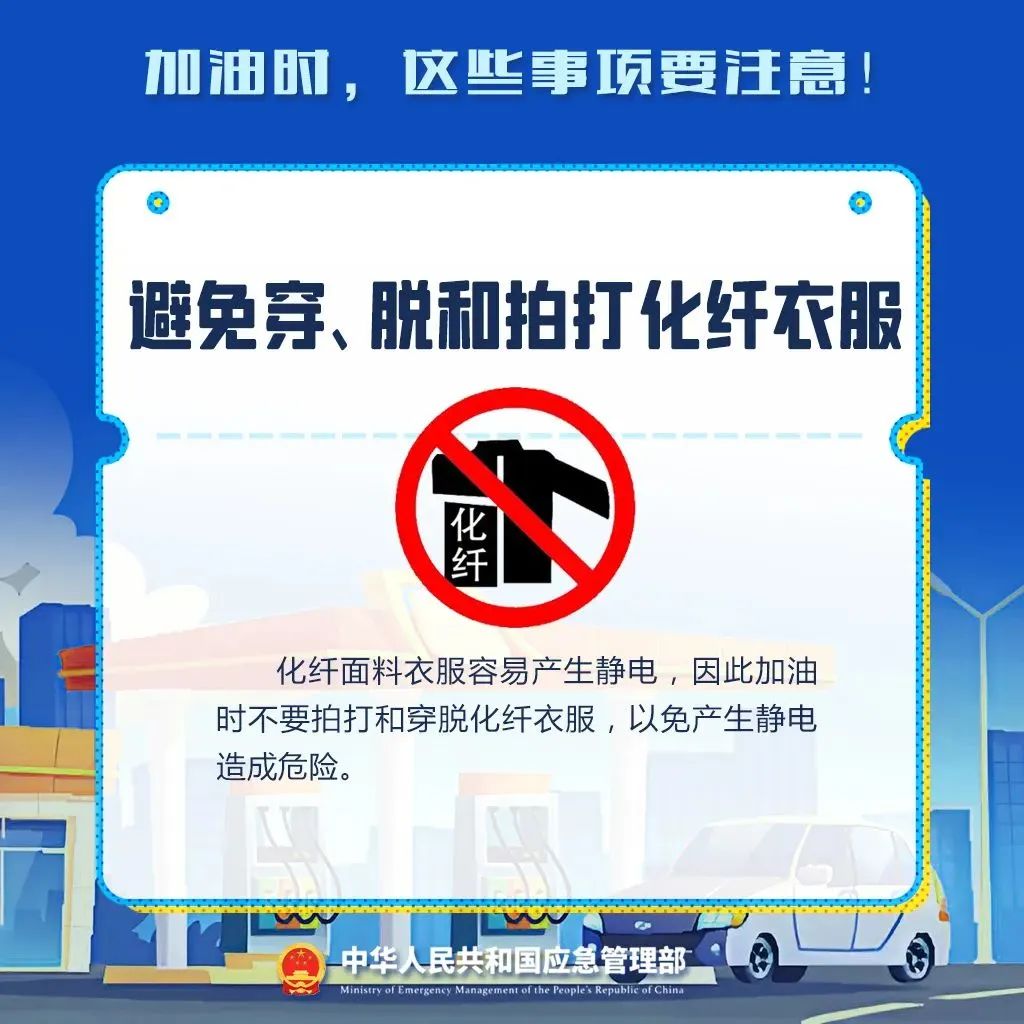 给油前接触静电释放装置,加油时油枪与油箱口紧密接触,在给油时防止行走、穿脱衣物。