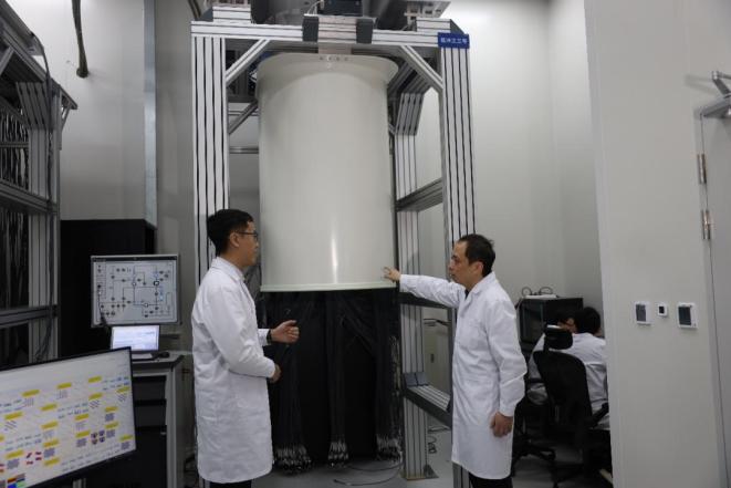中国科学技术大学朱晓波(右)与学生讨论制冷机的状态。