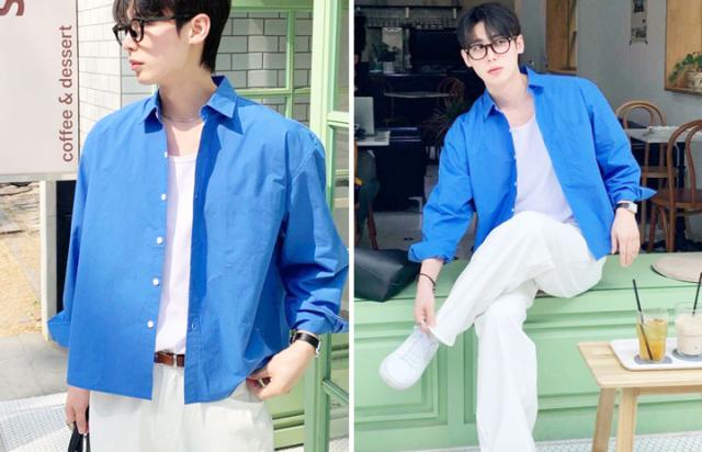 这件克莱因蓝衬衣,看起来很简单但很大气,上身很有活力,街头风格和轻熟范都恰到好处。