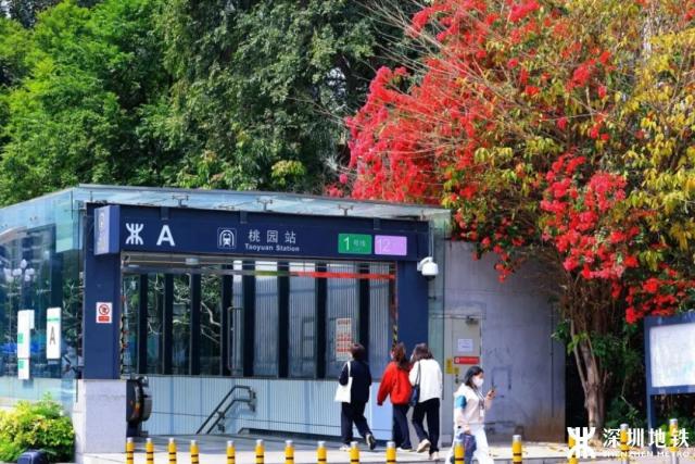 位于南山区南山大道与桃园路交叉口的桃园站, 1 号线与 12 号线的换乘站。诗意的站名不禁让人想象出一幅桃花盛开、鸟语花香的世外桃源景象。